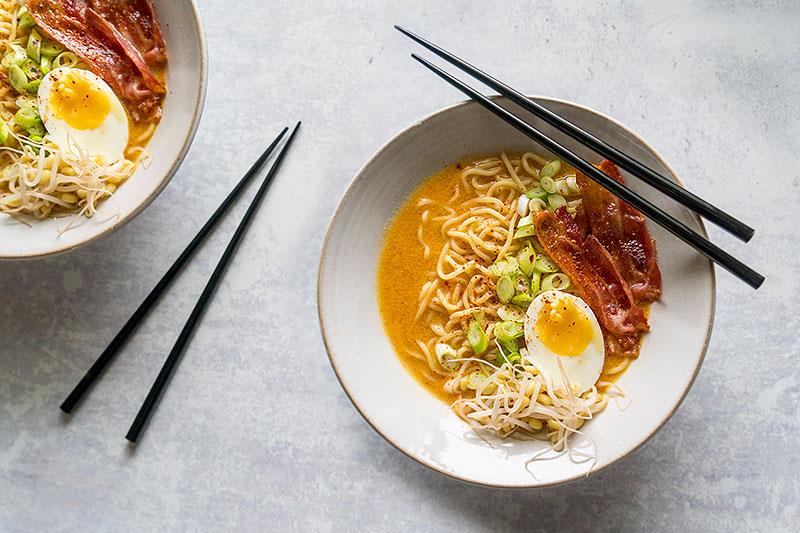 Ramen är en läcker japansk nudelsoppa som kan varieras efter smak. Här är en lättlagad variant med miso, sesampasta, ägg, bacon och vårlök.