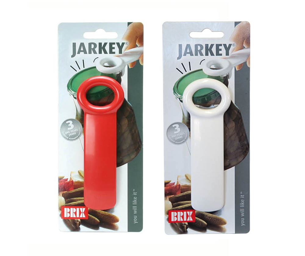 Patenterad och designbelönad burköppnare som passar alla traditionella konserveringsburkar. JarKey placeras mot burkens lock och med ett lätt lyft släpps vakuumet och locket kan nu enkelt skruvas av..