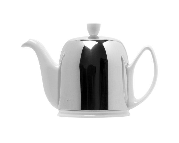 Vit tekanna från serien Salam av franska Guy Degrenne. Den vackra tekannan har en tidlös design och förhöjer varje testund till det yttersta. Salam-kannan har ett isolerande lager i huvan vilket gör att den håller värmen. Med den medföljande tesilen brygger du enkelt en härlig kanna av ditt favoritte.
