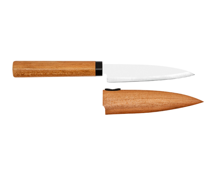 Enkel och smidig fruktkniv från KAI med vackert trähandtag och tillhörande fodral. Handtaget och fodralet är tillverkade av körsbärsträ och bladet är i rostfritt stål. Kniven passar utmärkt till att skala och skära små grönsaker och frukter.