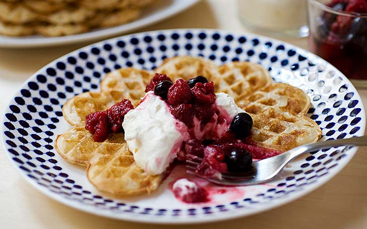Vem älskar inte riktigt frasiga, nygräddade våfflor med grädde och sylt? Våga variera och testa dem även som lunch tillsammans med lite gräddfil, lax och gräslök.