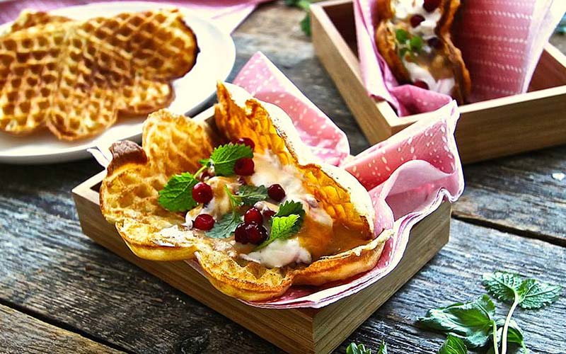 5. Värm upp ett våffeljärn och grädda våfflorna gyllenbruna enligt anvisningen på förpackningen. Varmhåll eventuellt de färdiggräddade våfflorna i ugnen på 100 grader.